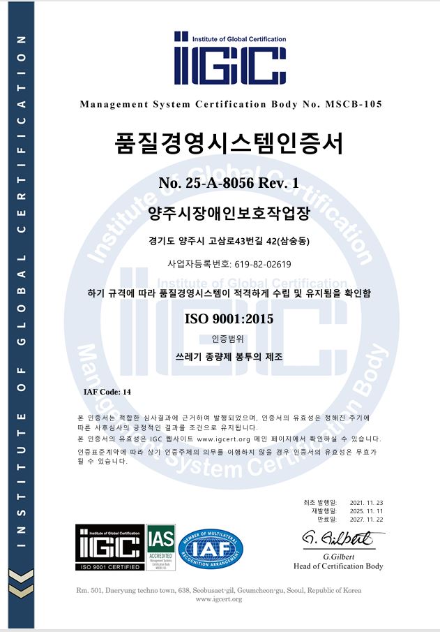 양주시 장애인보호작업장 품질경영시스템(ISO 9001:2015) 적격 유지 갱신