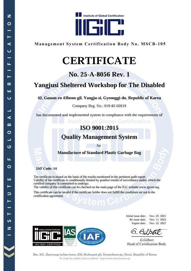 국제인증(인증범위 : 쓰레기 종량제 봉투의 제조)을 갱신하였기에